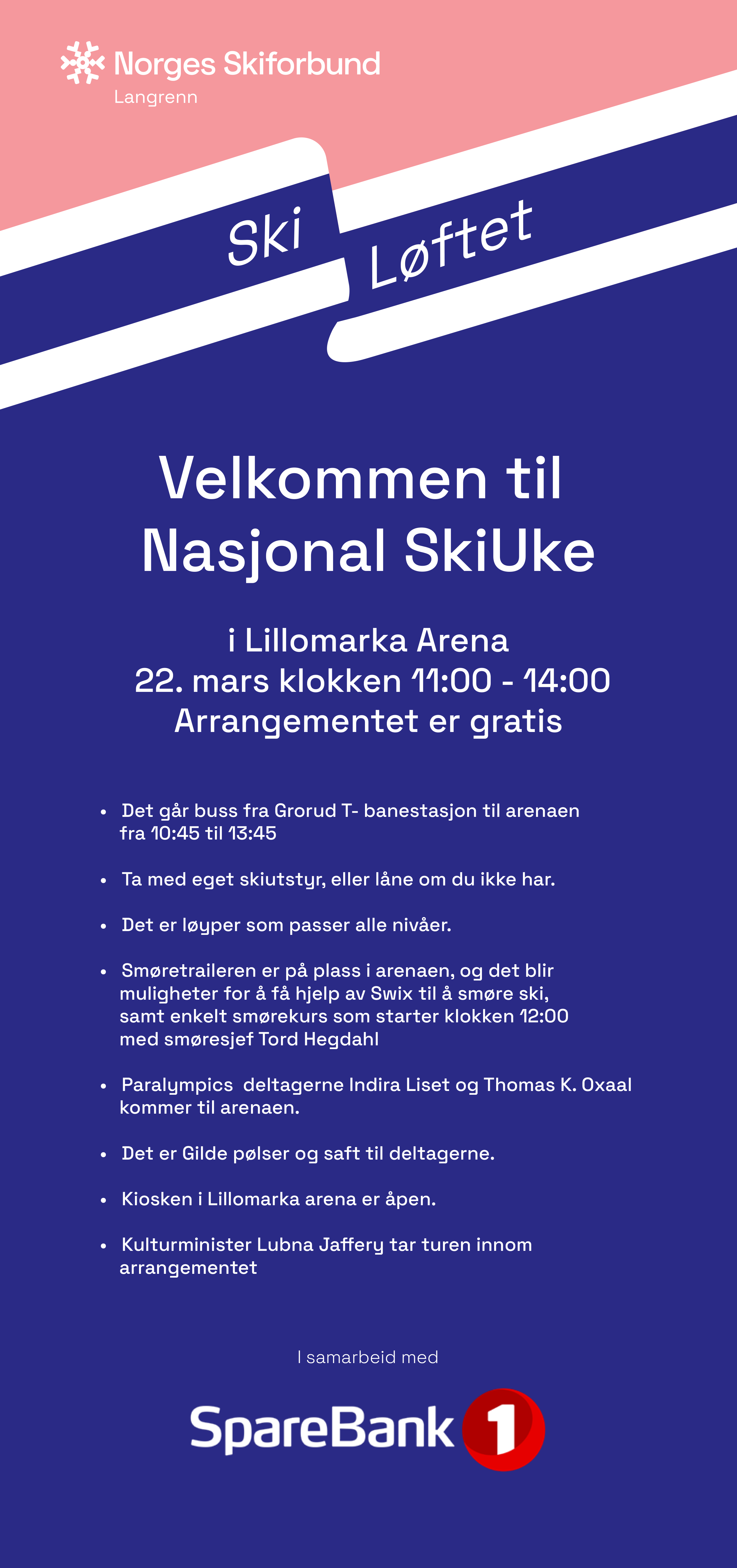 ----- Forwarded message from "Andersen, Tove" <tove.andersen@skiforbundet.no> ----- Date: Wed, 18 Mar 2026 07:53:44 +0000 From: "Andersen, Tove" <tove.andersen@skiforbundet.no> To: annik <annik@lynski.no>, "'Tor Eirik Ombustvedt, (LYN)'" <TEO@lynski.no>, Lea Rimol <learimol1@gmail.com>, Lars Bjørndal <lars@lamasti.net>, "parasport@heming.no" <parasport@heming.no>, Heidi Haarstad <heidi.haarstad@merckgroup.com>, "'aprilstilley@yahoo.no'" <aprilstilley@yahoo.no> CC: "Andersen, Tove" <tove.andersen@skiforbundet.no>, Christine Utne <christine.f.utne@gmail.com>, "Rovelstad, Tommy" <tommy.rovelstad@skiforbundet.no> Subject: Nasjonal SkiUke - GRATIS Skidag i Lillomarka Arena søndag 22. mars 2026 Til dere klubber – Norges Skiforbund langrenn inviterer til 🎿 Åpen skidag for alle i Lillomarka Arena søndag 22. mars 11:00-14:00! ❄️ Velkommen til en inkluderende og morsom skidag med langrenn for hele familien! Denne dagen er for alle, med eller uten funksjonsnedsettelse – og vi vil spesielt oppfordre barn og ungdom med funksjonsnedsettelser til å bli med. Uansett type funksjonsnedsettelse: Du er hjertelig velkommen! 💙 Det viktigste er ikke nivå eller erfaring – 👉 Det viktigste er at du har lyst til å ha det gøy på ski! Dette kan du forvente: ✨ Ingen krav til erfaring ✨ Utlån av skiutstyr for de som trenger (ski, sko og staver) ✨ Mulighet for å prøve langrennskjelker med hjelp fra Skeno Vi har 4 løyper; en kort flat runde, en litt bratt løype med matte oppgaver, en skilekløype, og en langrenscrossløype med elementer * Vi har instruktører som hjelper til 😊 ✨ Besøk av Paralympics-deltakerne Thomas og Indira ✨ Smøretraileren til langrennslandslaget er på plass ✨ Gratis smørekurs kl. 12 med smøresjef Tord Hegedahl ✨ Besøk av kulturministeren 🌭 Alle deltakere får Gilde-pølse og saft 👨👩👧👦 Dette er en ekte familiedag – ta med små og store og bli med på en hyggelig dag ute i snøen! 🎉 Arrangementet er helt gratis Vi gleder oss til å se deg – velkommen til en dag fylt med mestring, inkludering og skiglede. Ingen påmelding det er bare å møte opp. Adresse for dagen er: Hukenveien 29, 0963 Oslo 🚌 Gratis buss fra Grorud T-bane stasjon til arenaen kl 10:45 - 13:45 Vi hadde satt pris på om dere kunne delt dette med deres medlemmer. På forhånd TAKK 😊 Med vennlig hilsen Tove Andersen Skiklubbutvikler Mobil: +47 92030632 tove.andersen@skiforbundet.no<mailto:tove.andersen@skiforbundet.no> www.skiforbundet.no/oslo/<http://www.skiforbundet.no/oslo/> [cid:image001.png@01DCB6B3.70CAEAA0] ----- End forwarded message -----