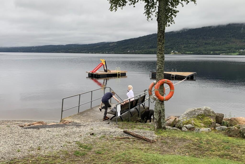 Tøffinger: Stine og Lars er de eneste som våger seg på et bad i Hurdalsjøen.