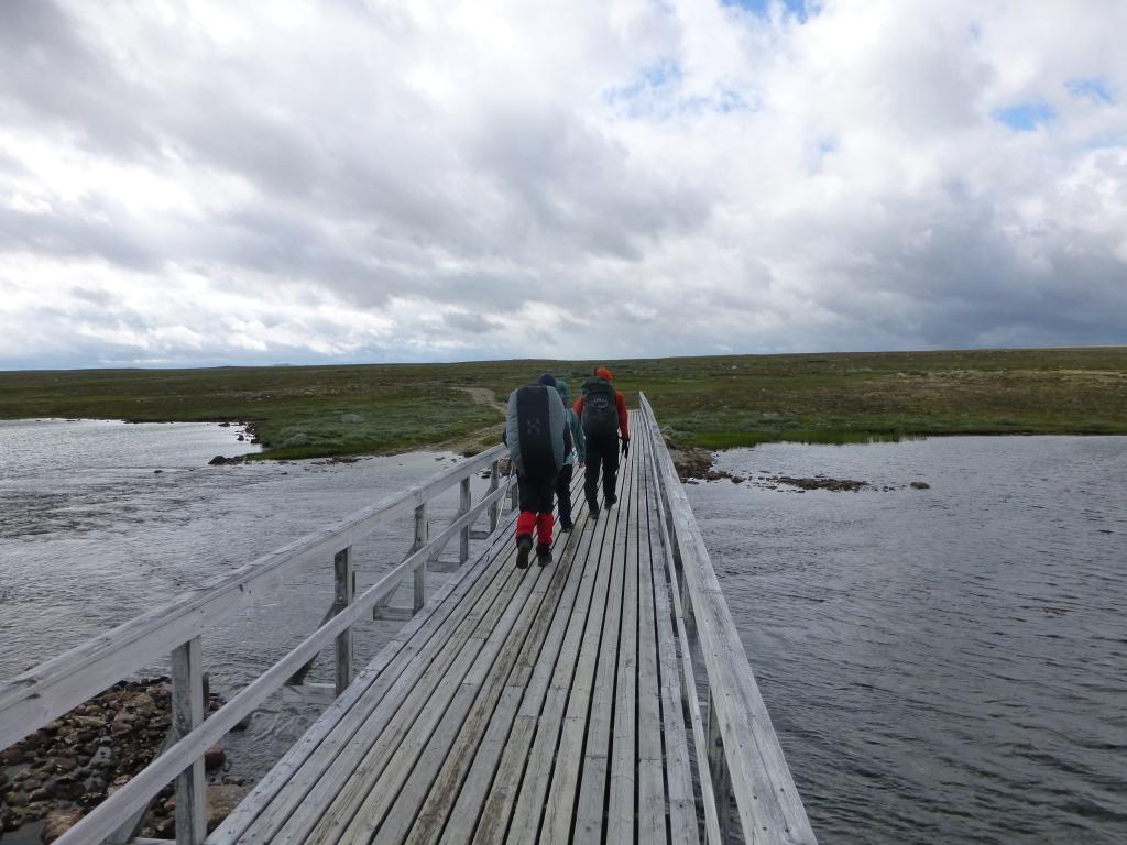 Vi søker ly for vinden ved noen kampesteiner før kryssing av bru ved Simletindvatnet.